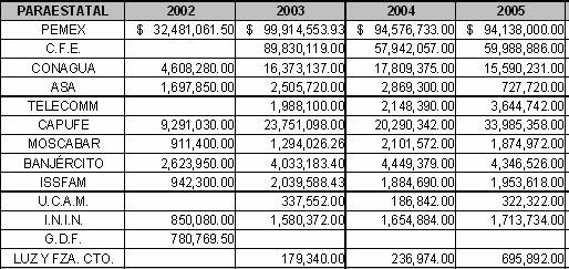 PREGUNTA. CUÁL FUE EL DESTINO DEL DINERO PAGADO POR LAS PARAESTATALES POREL SERVICIO DE PROTECCIÓN A SUS INSTALACIONES A LA SEDENA COMO SON DESTACAMENTOS Y PATRULLAJE MILITAR. ETC, LOS OFICIALES Y PERSONAL DE TROPA ¿RECIBEN ALGUNAPARTE DE ESTE DINERO? ¿CUAL FUELA CANTIDAD PORPARAESTATAL POR AÑO DESDEEL 2000HASTAEL 2005. OTROS DATOS PARA FACILITAR SU LOCALIZACIÓN: PEMEX GERENCIA DE SERVICIOS DE SEGURIDAD FÍSICA. RESPUESTA. CON FUNDAMENTO EN LOS ARTÍCULOS 42 PÁRRAFO PRIMERO Y 46 DE LA LEY FEDERAL DE TRANSPARENCIA Y ACCESO A LA INFORMACIÓN PÚBLICA GUBERNAMENTAL Y 70 FRACCIÓN V DE SU REGLAMENTO, SE HACE DE SU CONOCIMIENTO QUE EN LOS ARCHIVOS DE ESTA DEPENDENCIA, ÚNICAMENTE SE TIENEN ANTECEDENTES DE LOS INGRESOS EXCEDENTES CAPTADOS DEL 2002 AL 2005, POR CONCEPTO DE LOS SERVICIOS DE SEGURIDAD Y PATRULLAJE PROPORCIONADOS A DIVERSAS PARAESTATALES, SIENDO LOS SIGUIENTES:
